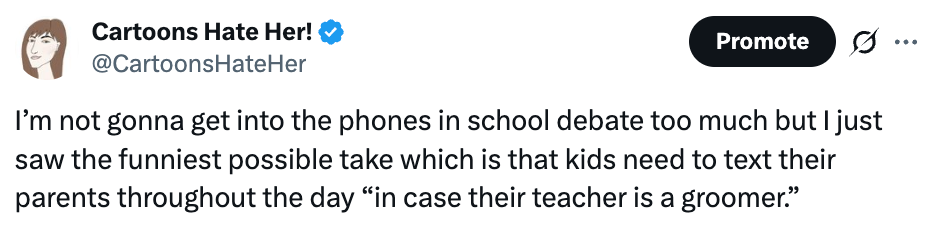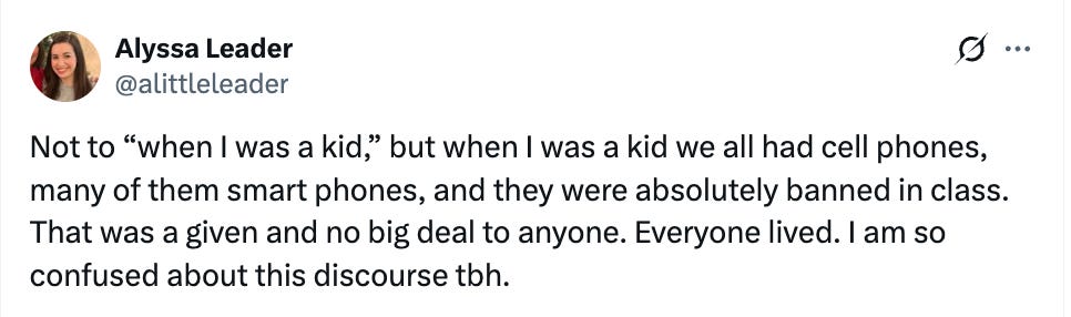 The most sane take I saw on the whole thing came from this woman. I had the same thought. I didn’t have smart phones in high school, but we did have cell phones, and they were banned in class! You couldn’t text your mom in class or they’d take your phone away. Seemed reasonable? Also, not that I agree with her, but Taylor Lorenz initially did say that banning phones during classtime was okay, she just didn’t trust that the motivation was about learning or education.