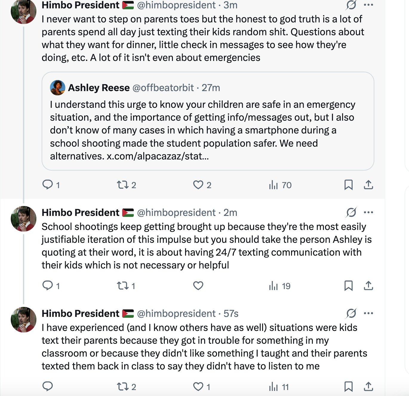 Most people on Twitter agreed that phones should be banned in schools (or at least during classtime.) Several people brought up the issue of school shootings as a reason kids need phones on them during class, but others pointed out that having a phone with you wouldn’t actually make you safer: