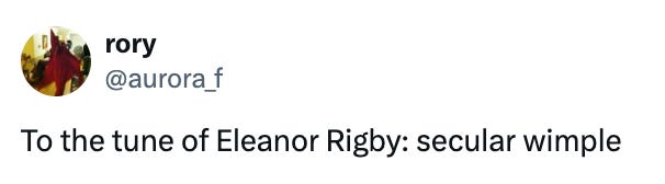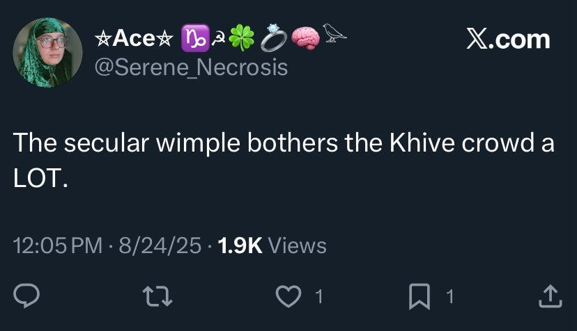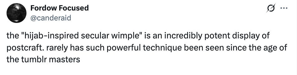 Given the otherwise inflammatory nature of their posts, I assumed this was a masterful attempt at 2010s-era Tumblr trolling, but some posts indicate they may be real. Either way, they managed to ascend to Main Character status quite literally all week. And who am I to judge? After all, let him who is without a secular wimple among you cast the first stone.”