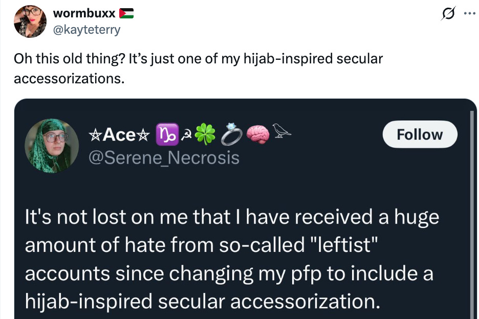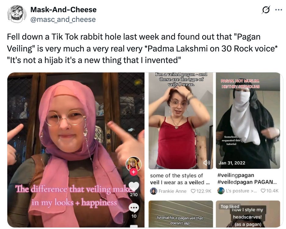 At some point this week, I started seeing a lot of this account which referred to white people as “cracker settlers” (among some other content in this general milieu) but also appeared to be white. Upon closer inspection, this person was also wearing some kind of Wiccan amulet and what appeared to be a….forest green crushed velvet hijab? Knowing that they couldn’t possibly be Muslim and Pagan simultaneously, I wondered what the hell was going on. As it turns out, other people were wondering too. They clarified that the hijab was actually a “hijab-inspired secular accessorization.”
