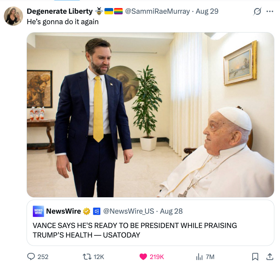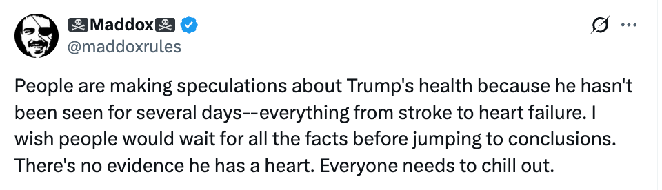 This didn’t come entirely out of nowhere. Lately Trump has been seen with weird-looking infusion bruises on his hands, which caused some people to cast doubt on his health. In a recent interview, JD Vance was asked about Trump’s health, which led to a particularly inconvenient quote: