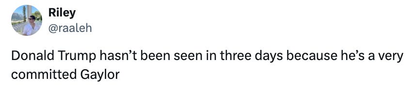 As I covered earlier this week, Taylor Swift got engaged to her boyfriend of two years, Travis Kelce. At the time, I focused on a particularly aggrieved Substack writer who felt that Taylor Swift was betraying the smart feminists of the world by succumbing to the patriarchal institution of marriage, and I merely glossed over another group of people who have been convinced for years that Taylor Swift is actually a lesbian: The Gaylors.