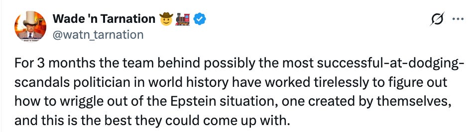 In case you’ve forgotten, the “Epstein files” still haven’t been released. A DOJ aide ensnared by a dating app honeypot apparently revealed that the plan was to redact Republicans on the list while leaving Democrats there (how shocking!) What’s actually shocking was that this ploy came from the O’Keefe Media Group, a sketchy far-right organization, not some bleeding heart progressive lib journalist.