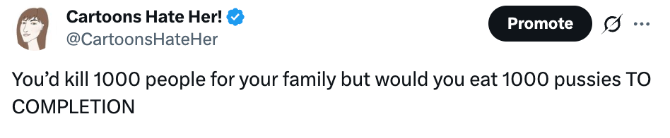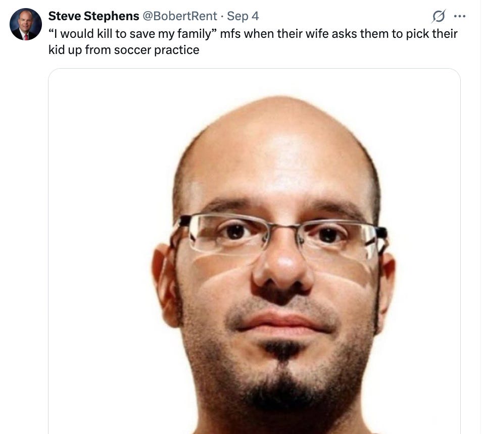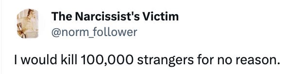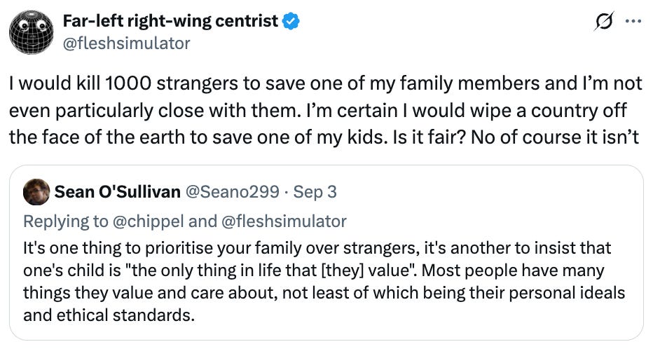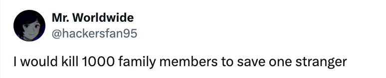 We got some other takes around the idea of a vaguely-justified desire to murder strangers, along with the observation that many who would “kill” for their families in theory would not do much easier and banal things: