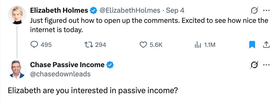 My current favorite Twitter troll (perhaps tied with ratlimit) has a new victim: Elizabeth Holmes.