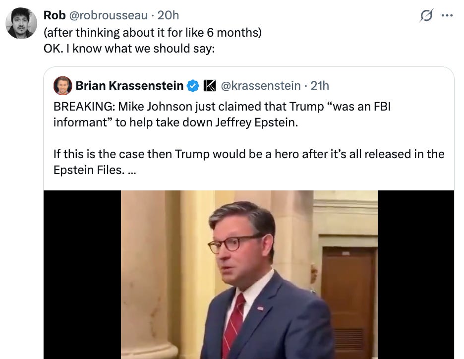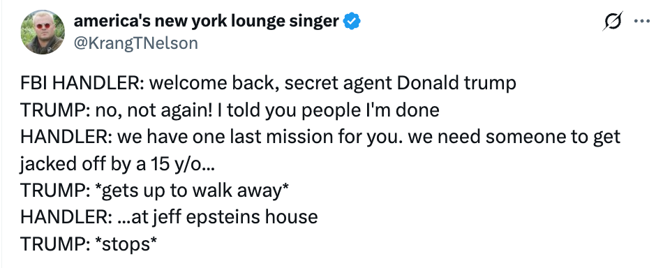 So anyway, given that Trump is pretty clearly on the list (as Elon Musk pointed out during his epic now-deleted Twitter thread—about which I did a Trump impression, here) they have a new talking point: yes, he was in the files, because he was a secret FBI informant trying to take Epstein down.