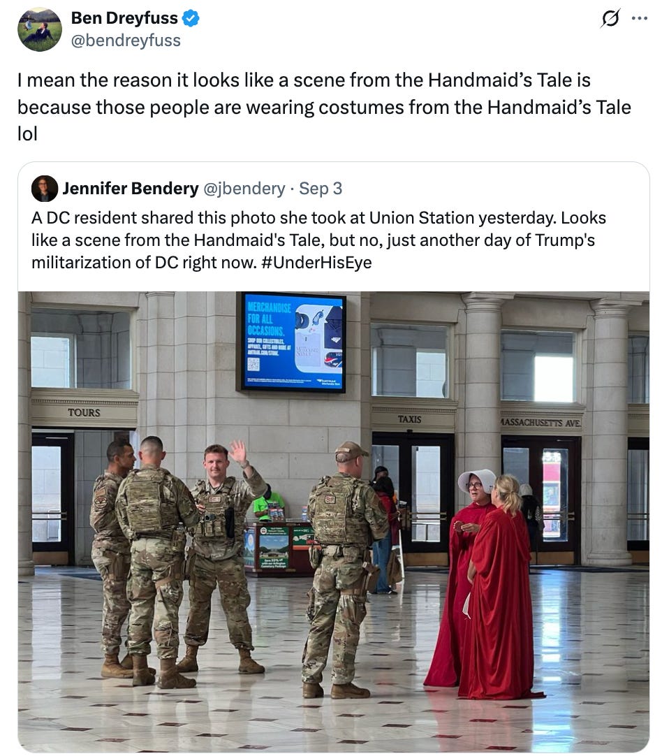 Eerily, things are beginning to look a lot like The Handmaid’s Tale, in part because of the costumes people are deliberately wearing to create this effect (courtesy of