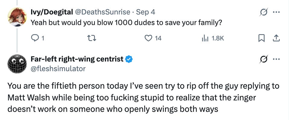 Every time this comes up, someone tries a “gotcha” by asking the person if they would blow 1000 guys to save a family member. But this guy is bisexual, so it didn’t work on him: