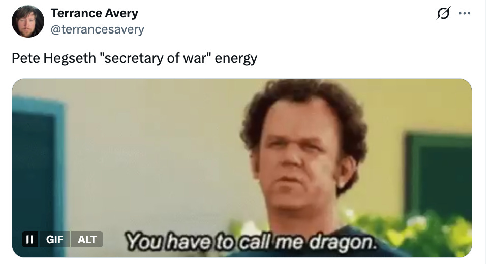 I’ve always felt a little weird about the title “secretary” for masculine-coded roles. Don’t you? I mean, you hear “secretary” and you think high heels and pencil skirts. Well, not anymore, you absolute fucking cucks! Because the artist formerly known as Pete Hegseth, “Secretary of Defense,” is now the “Secretary of War.” Based!