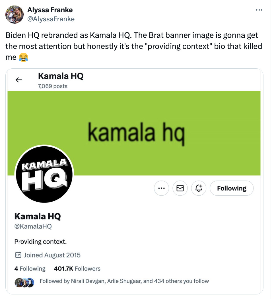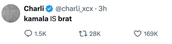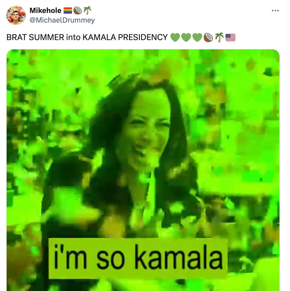 Are you having a brat summer? First, no, you’re not, you’re thirty-four. But you know who is? Kamala Harris, endorsed by Biden to be the next Democratic nominee, and endorsed by Charli XCX as brat: