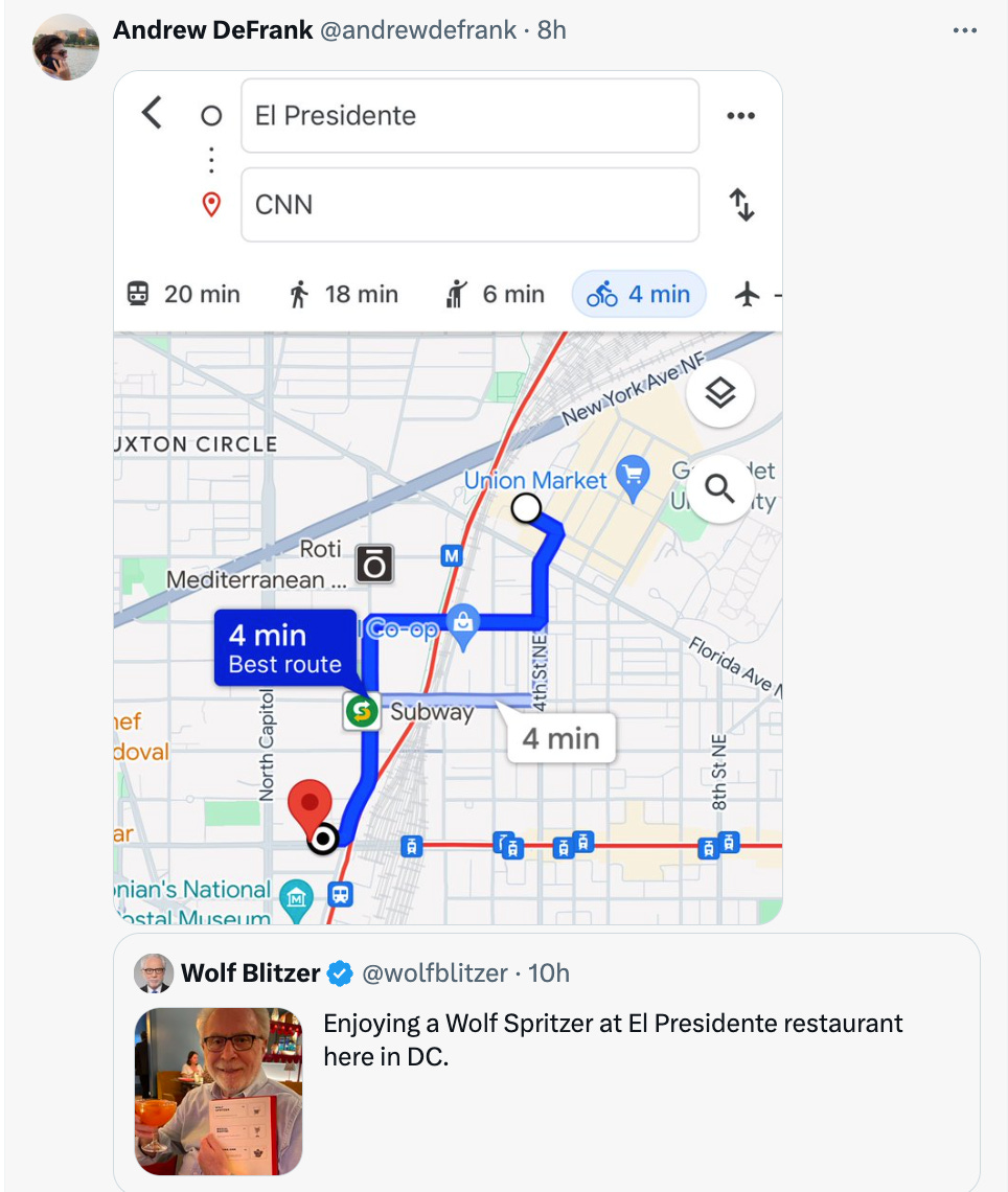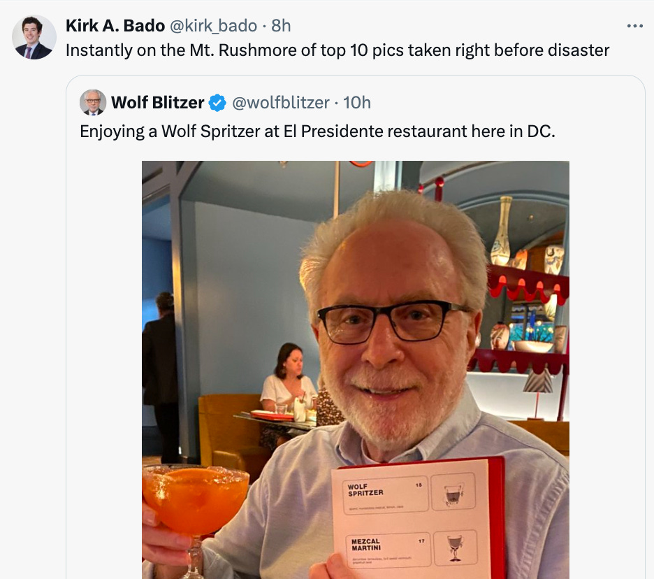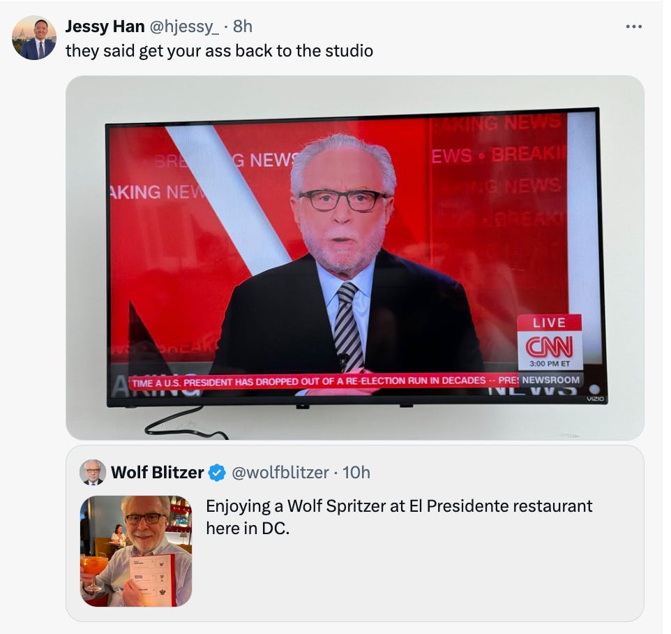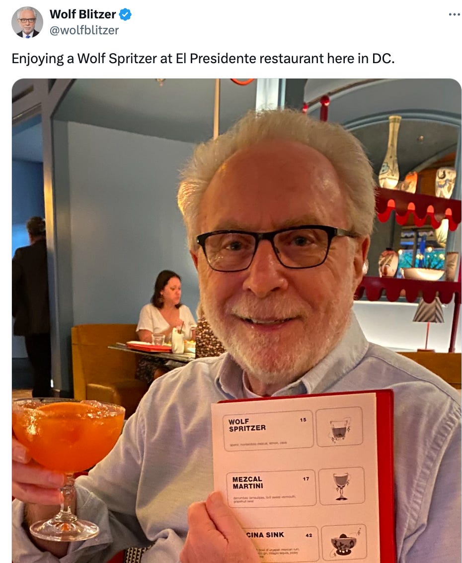 Wolf Blitzer was apparently enjoying a drink called a “Wolf Spritzer” on his day off, when the Biden news pulled him back to the office. And he looked like he was having so much fun too!