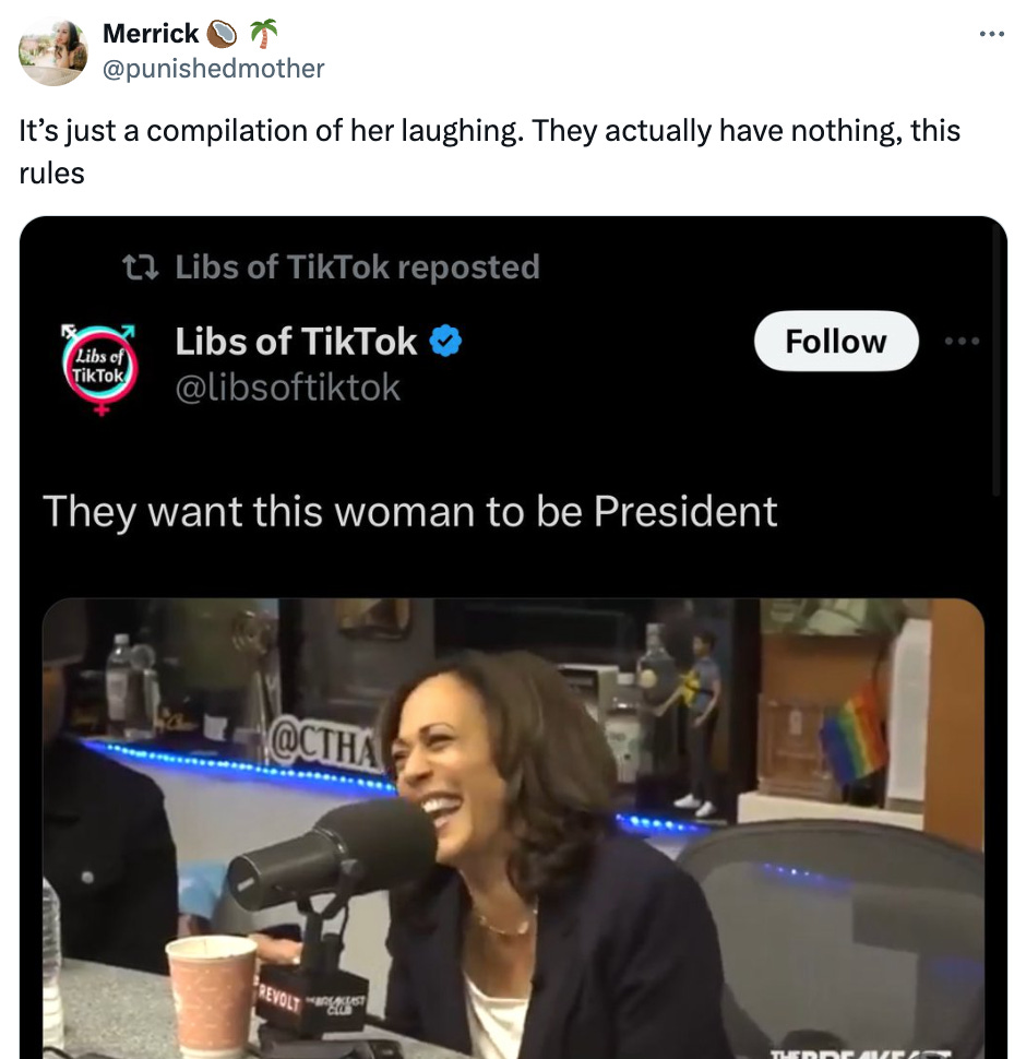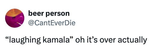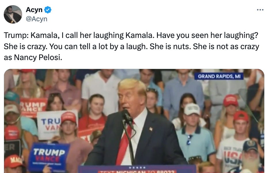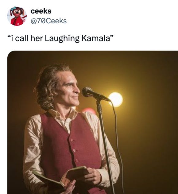Despite all the worries about Kamala being unelectable, the right has really fallen flat as far as Kamala smearing goes. So far, the main thing they’re going with is that…she laughs a lot. Come on, that’s one of the best things about her! Trump, who I’ve said for a while is losing his juice as far as catchy nicknames go, has dubbed her “Laughing Kamala.” It’s so over.