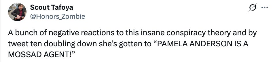 Honestly, say what you will about this lady, but I respect the hustle. She’s bringing us 2019-tier takes that we haven’t been able to see in what feels like decades. Lately, it’s all low-effort right-wing slop about the Jews controlling Hollywood and almost no left-wing galaxy brain conspiracy theories about Nazis controlling Hollywood. I, for one, support diversity of THOUGHT.