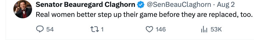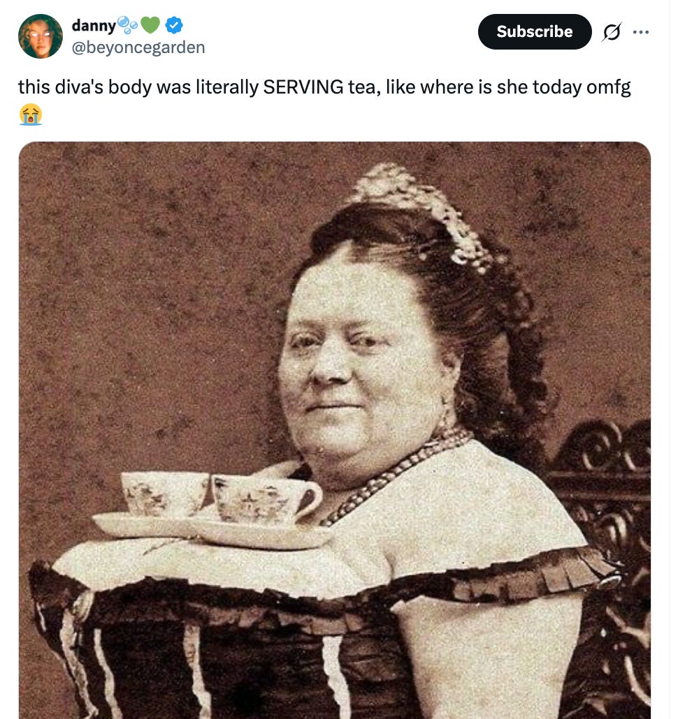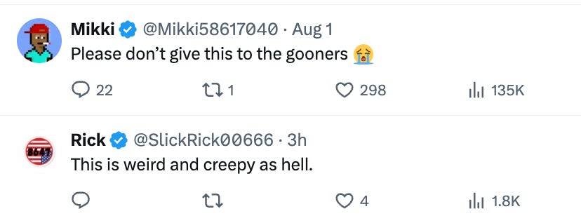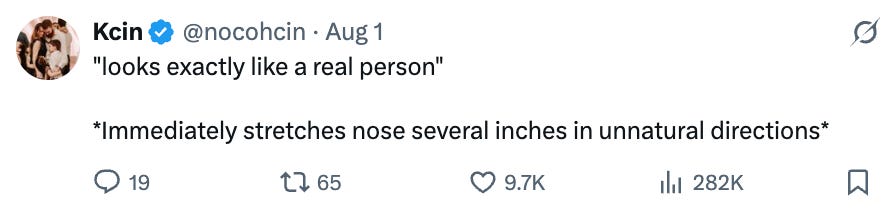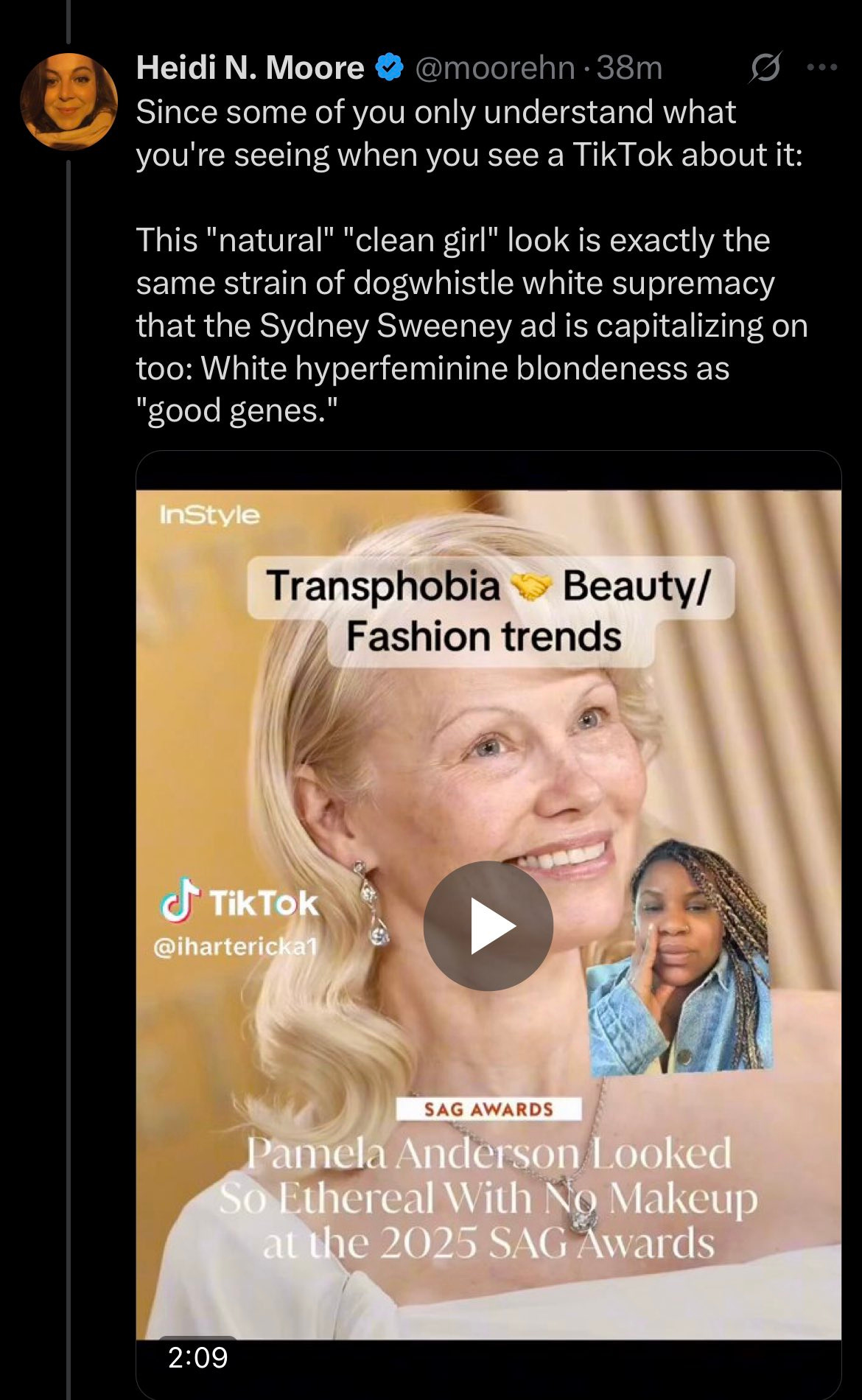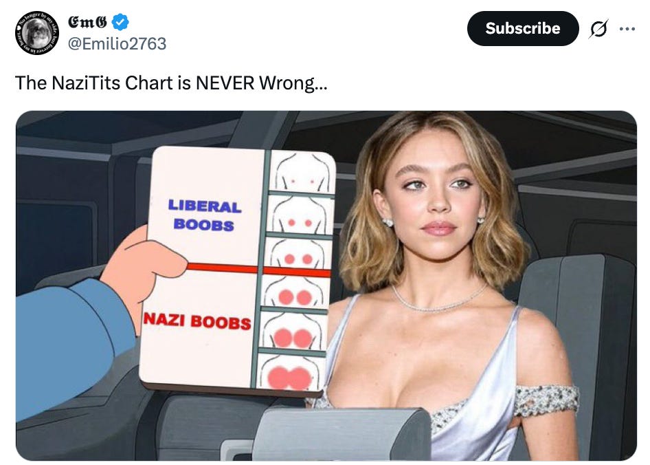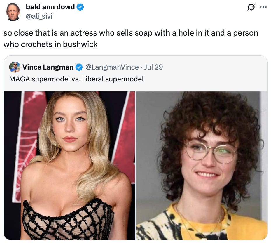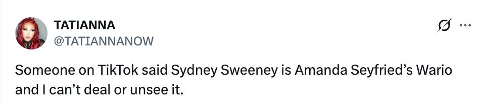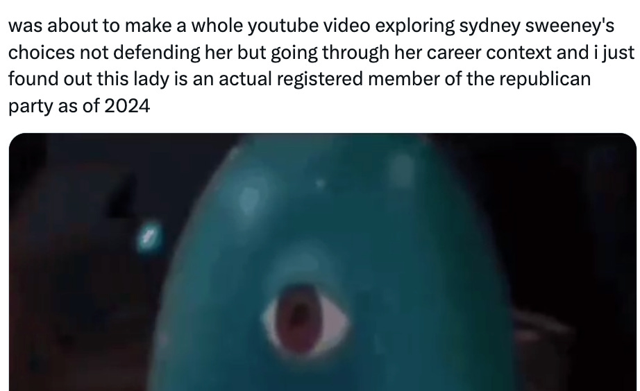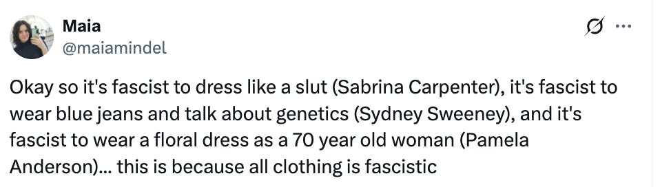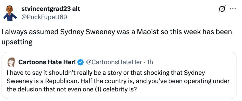 Well, people are still talking about the Syndey Sweeney AE ad—the good, the bad, the bad about the bad, the backlash to the bad and the backlash to the backlash. I wrote about it yesterday. But anyway, I think on Twitter we’ve reached the “esoteric funny joke” stage, which is far preferable to anything political.