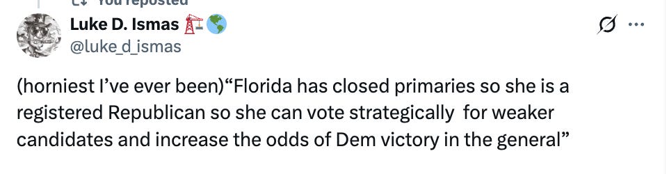 “The horniest I’ve ever been” tweet justifying why Sydney is a registered republican is hilarious 🤣🤣