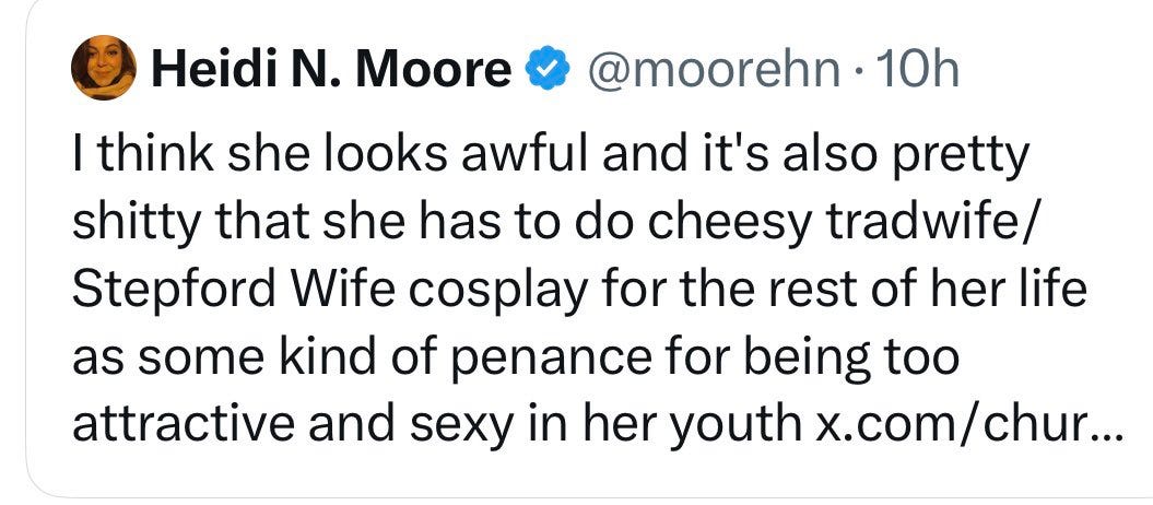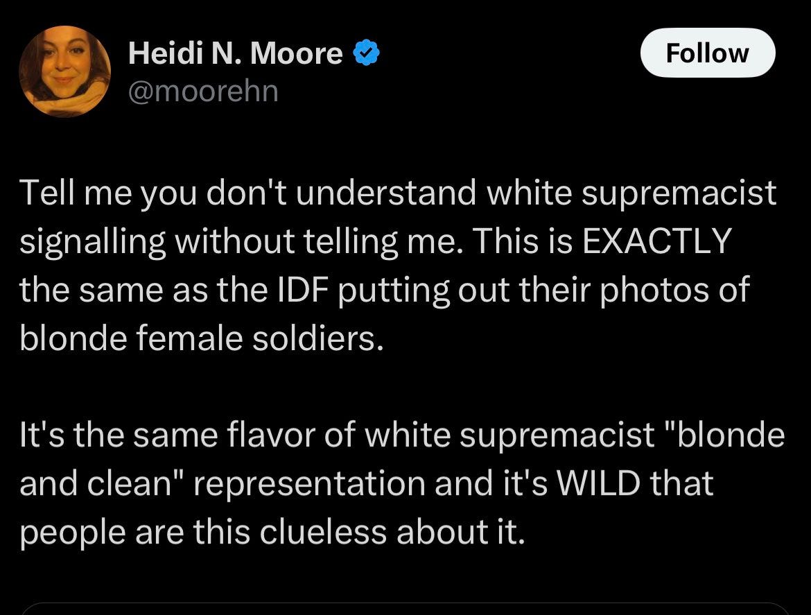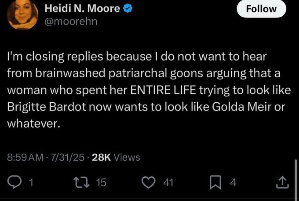 Most people were not on Heidi’s side, and in fact she locked her account after the backlash presumably got out of hand (so let’s not be too mean about it—just reporting the discourse of the week here, not trying to start a bullying campaign.) But anyway, somehow this turned into an Israel and somehow also transphobia thing? I don’t even know anymore, man.