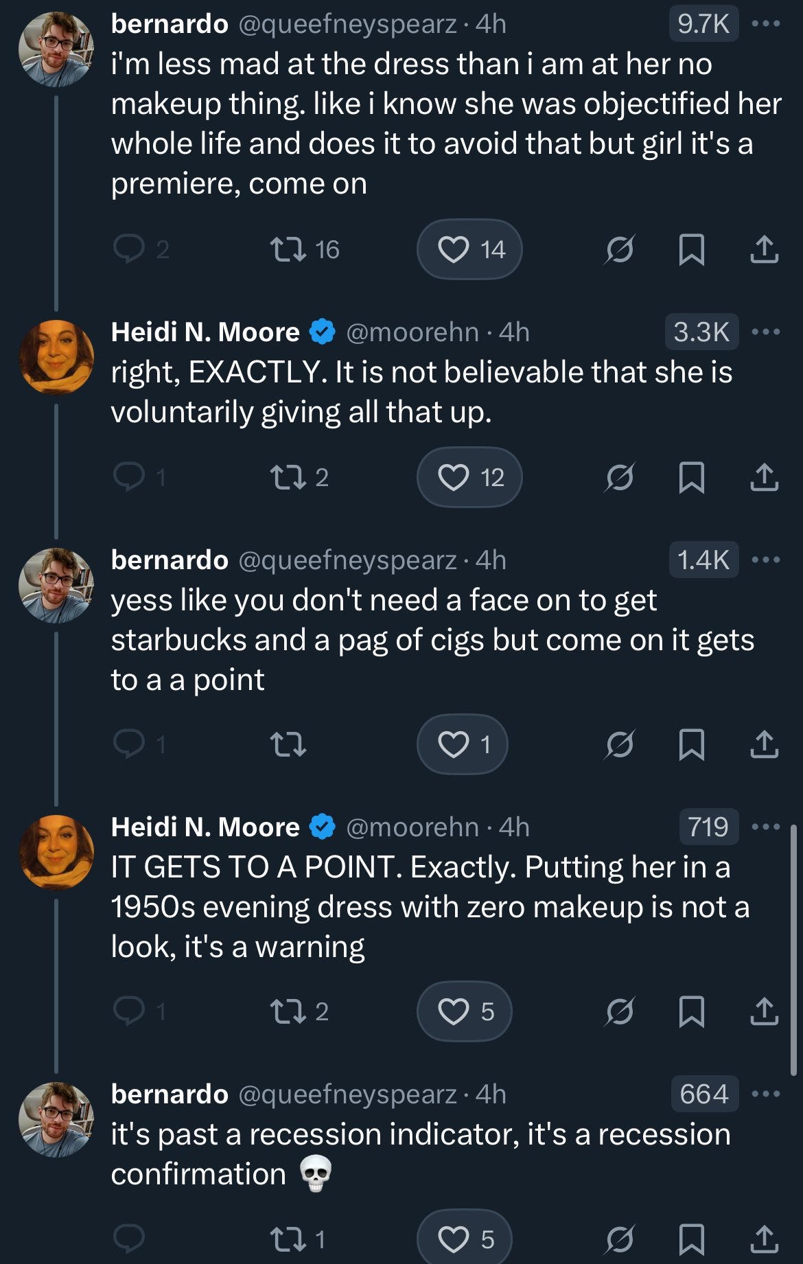 We've talked on here about the strange way that people try to make women wearing feminine clothes and makeup out to be "right-wing-coded"* and how insane that is (and it is), but it's equally insane to me how people will argue the opposite too - that women not wearing makeup, which is so much easier to do than the opposite, it's literally what you do if you roll out of bed in the morning, is also somehow a right-wing statement. The "it's a tradwife thing" is new to me (I thought the whole point of the "clean girl" look is that you are actually wearing a lot of product, just in a way that isn't immediately visible) but I've seen a lot of "you're a pickme disrespecting women's emotional labor when they put on makeup" type of discourse before. I've seen a lot of stuff in online queer communities that act like not wanting to wear make-up is somehow anti-queer, which, for starters, is a strange version of queer culture that seems to discount lesbians and our "culture" entirely....