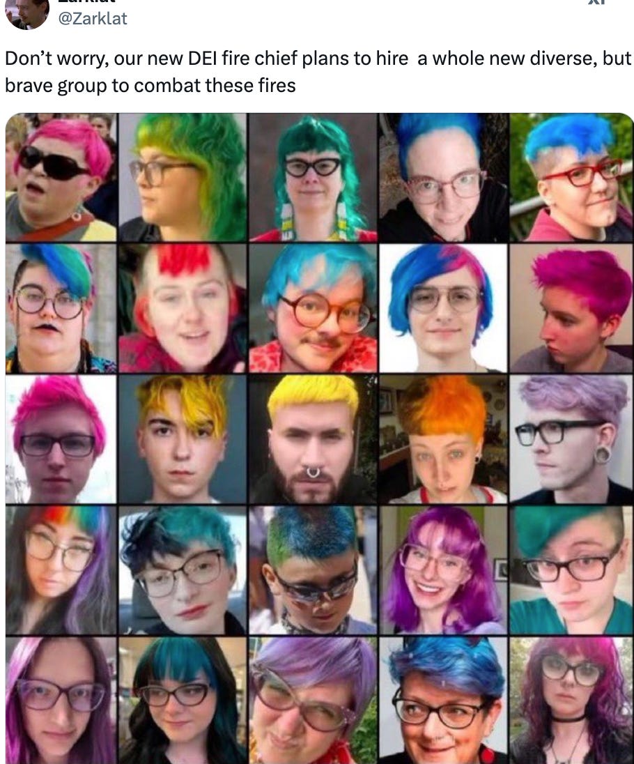 We got a bunch of “DEI” takes, but this one is probably my favorite because their idea of DEI is “lots of weird-colored hair on a group of exclusively white people.”