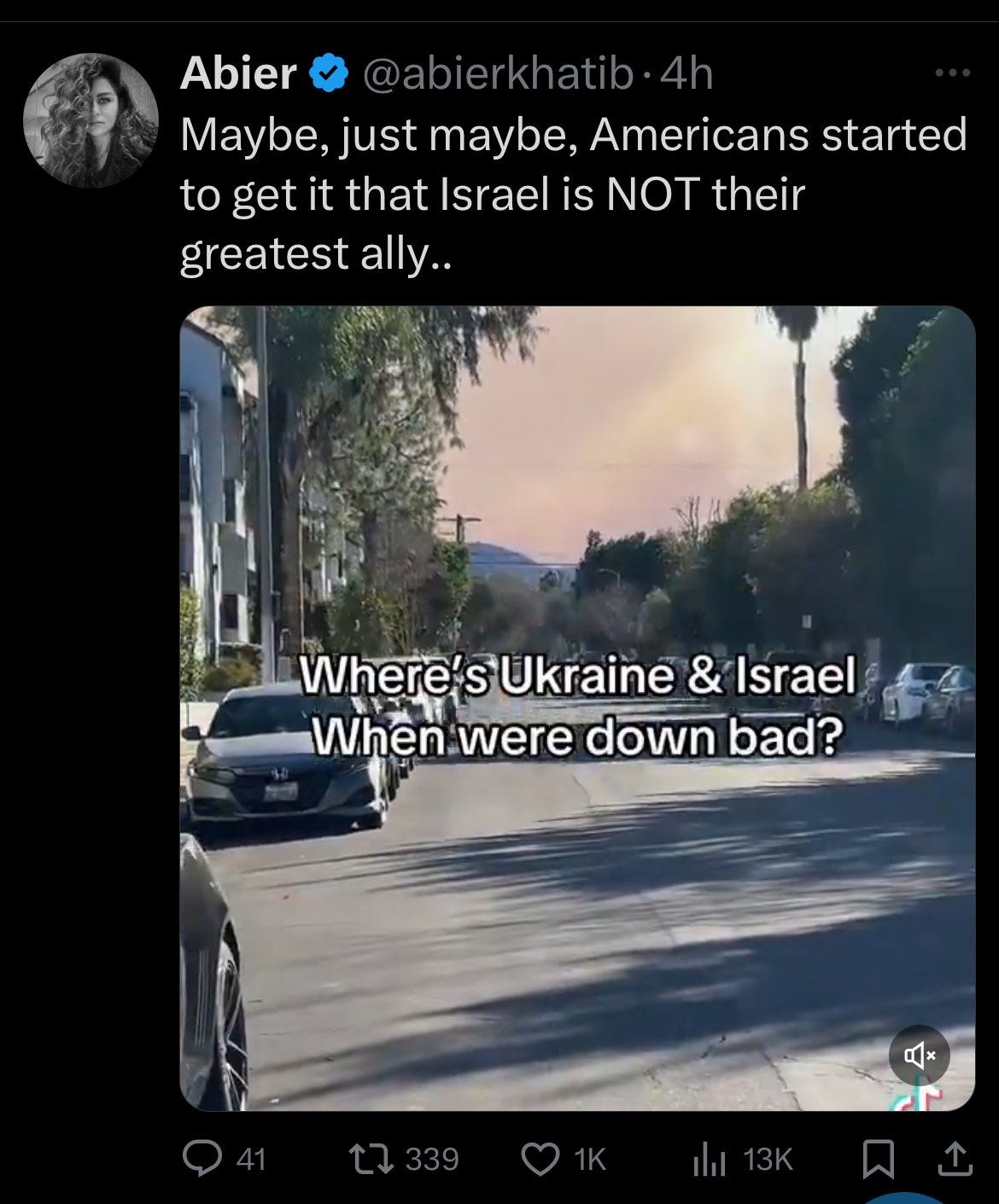 I don’t know if this person is right wing per se, but apparently Ukraine and Israel are supposed to be helping us with the fires and have forsaken us: