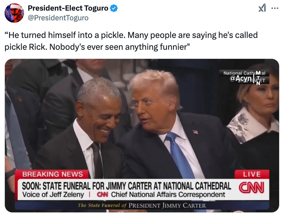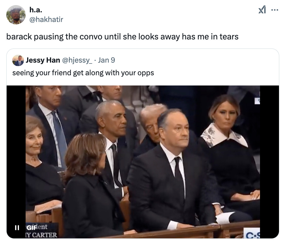 For those of you living under a rock, former president Jimmy Carter recently died. Whenever a former president dies, all the other former presidents and vice presidents come together like some sort of Bad Girls Club reunion episode. And this one was super juicy!