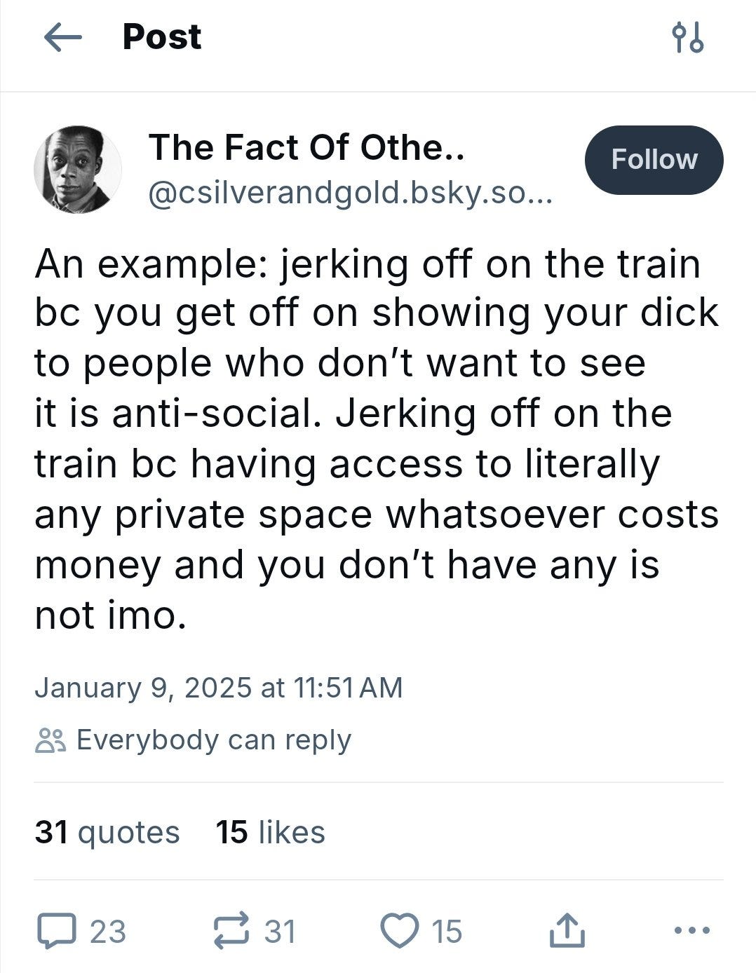 My favorite part of the “jerking off on the subway tweet” is that the guy’s avatar is James Baldwin, who’s surely rolling in his grave by association.