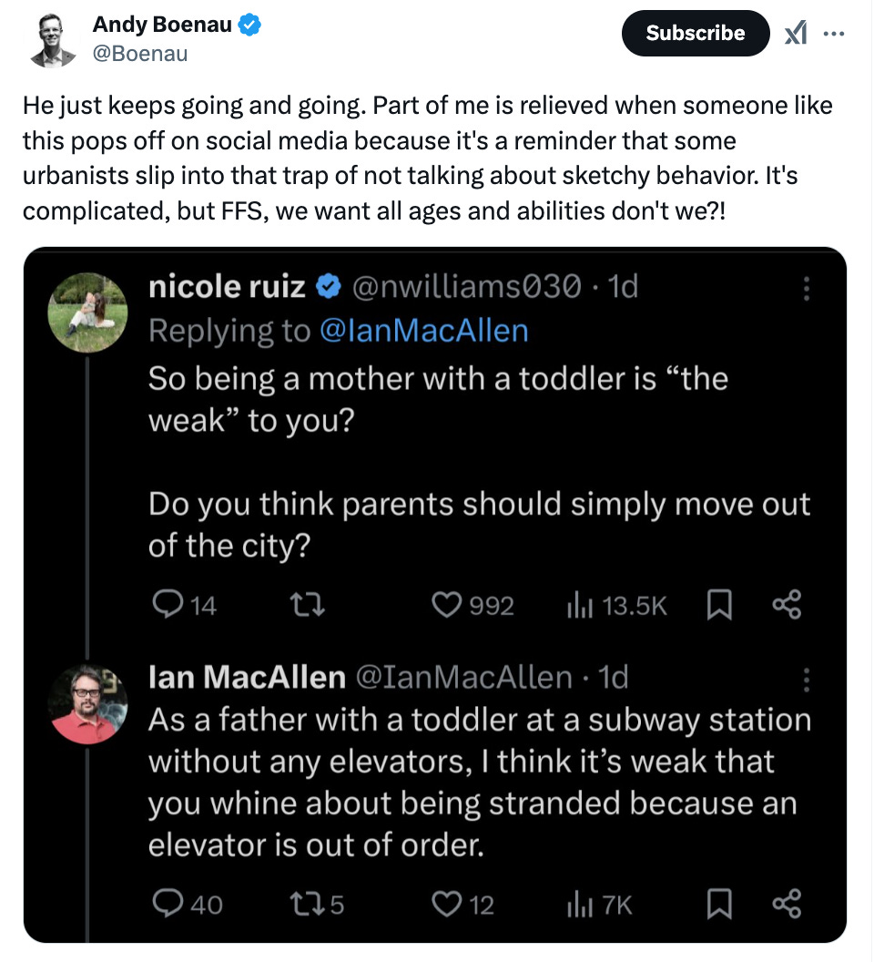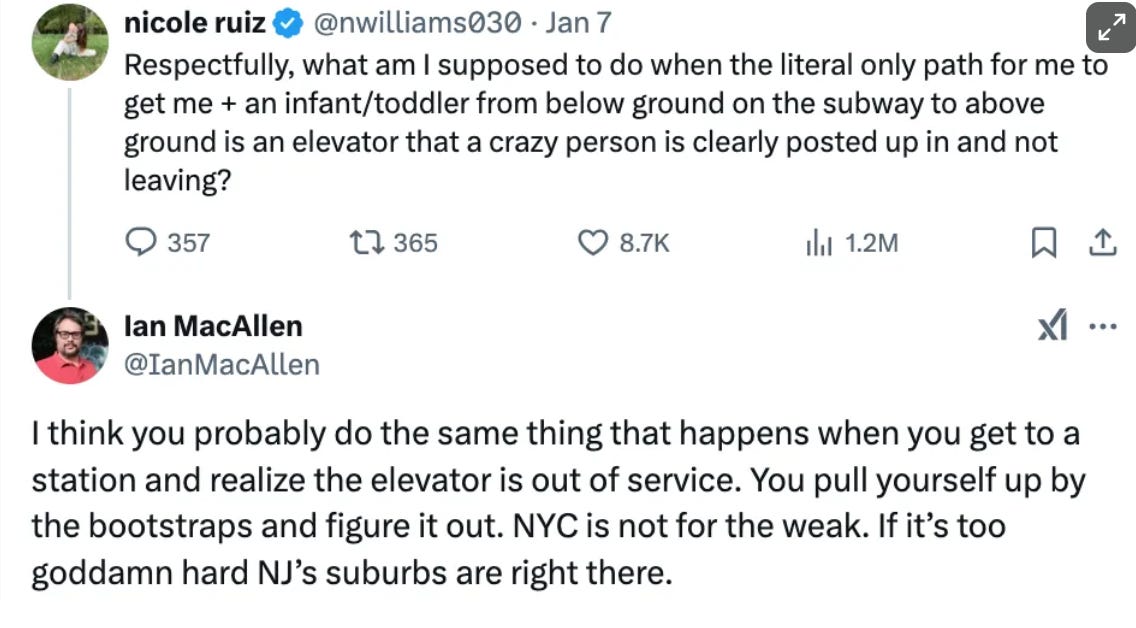 This week, a NYC mom expressed concern for her and her child’s safety on the NYC metro when she was unable to access an elevator. She was slammed by the people I’ve dubbed the “Defenders of Disorder” who told her to toughen up or leave the city: