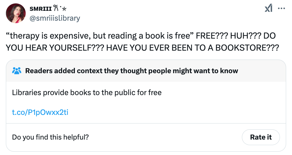 It seems like there’s a big part of Twitter that’s very pro-books in theory, but also doesn’t really want to read them. Today, we have a new Type of Person, someone who thinks books are too expensive. Community note at it again.