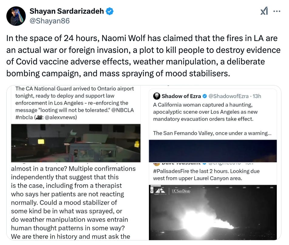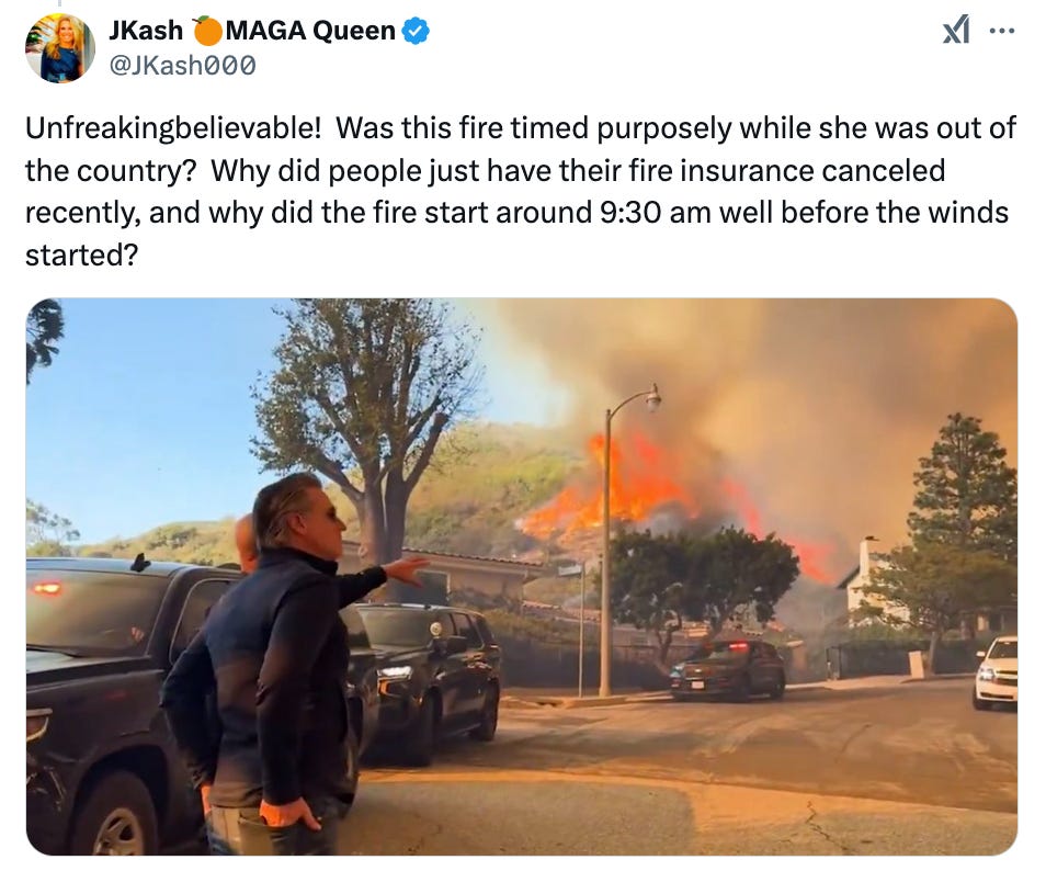I can’t quite figure out what this person is saying, but I guess she thinks that the Los Angeles Mayor (who was out of the country at the time the fires started) somehow orchestrated this, with the insurance companies? I don’t know.