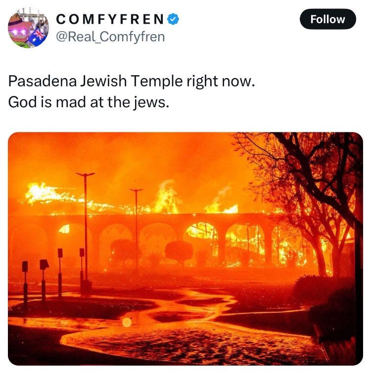 Naturally, right wingers are having a moment over the Los Angeles fires, because fires don’t just happen in California of all places, right? There has to be something more to this. Usually, when there’s “something more” it’s just the Jews.