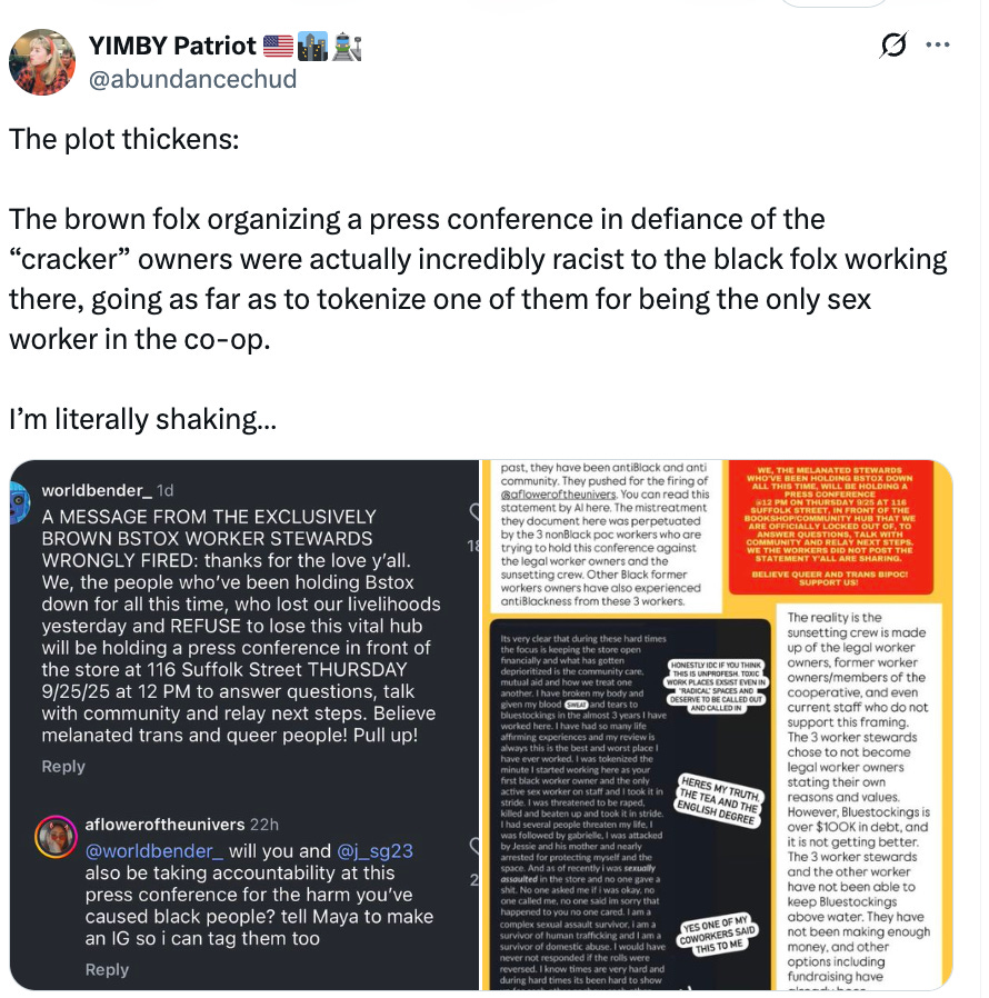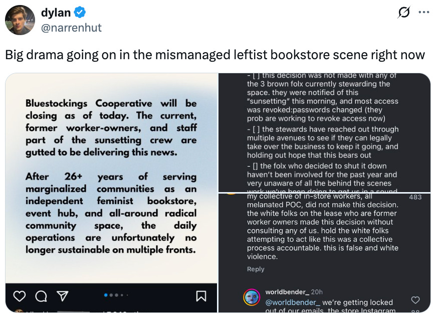 From what I can parse, the bookstore closed for financial reasons, but the decision wasn’t as unanimous as the initial Instagram post insinuated, and multiple former employees called them out for making this decision without consulting the (actual quotes here) “brown folx” or “melanated POC.”