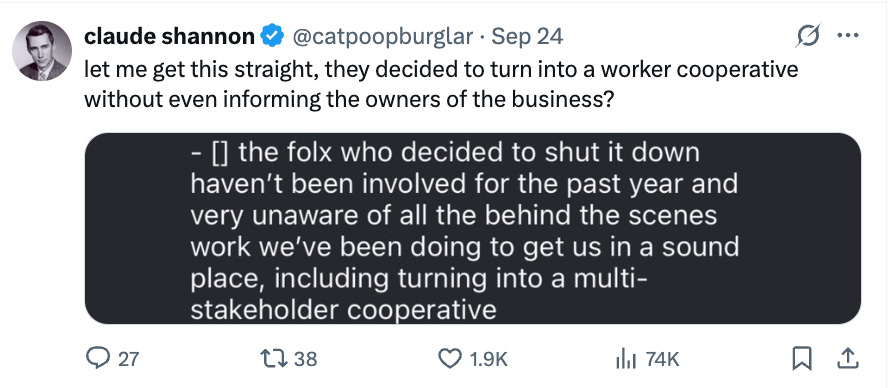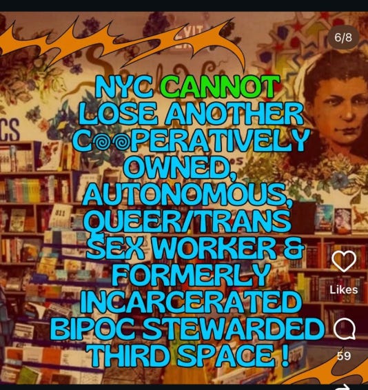 It also appears that the bookstore became a “worker owned cooperative” without the knowledge of whoever actually owned it. I dug a little deeper and it looks like they decided to be “owners” without actually taking legal ownership because they didn’t want to inherit the $100,000 of debt that the bookstore had amassed.