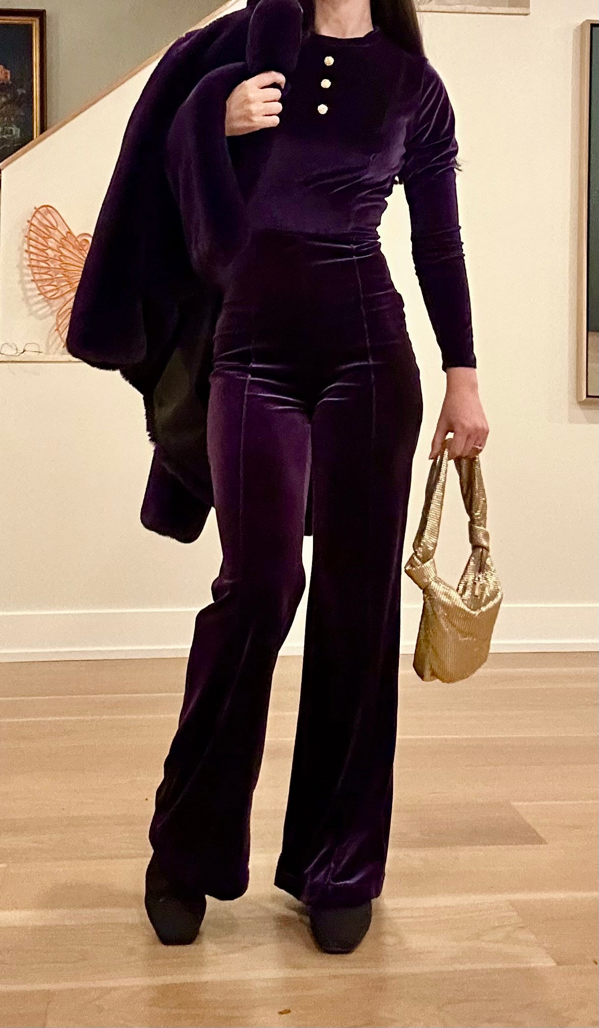 We also had a date night out with some friends and I thought, you know what, I’m gonna be cunty Grimace tonight. So I wore my purple velvet jumpsuit that I sewed earlier this year and paired it with an insane purple faux fur DVF/Apparis coat that I got on TheRealReal for $54. The gold bag here (also featured in the previous outfit) is from Cult Gaia.