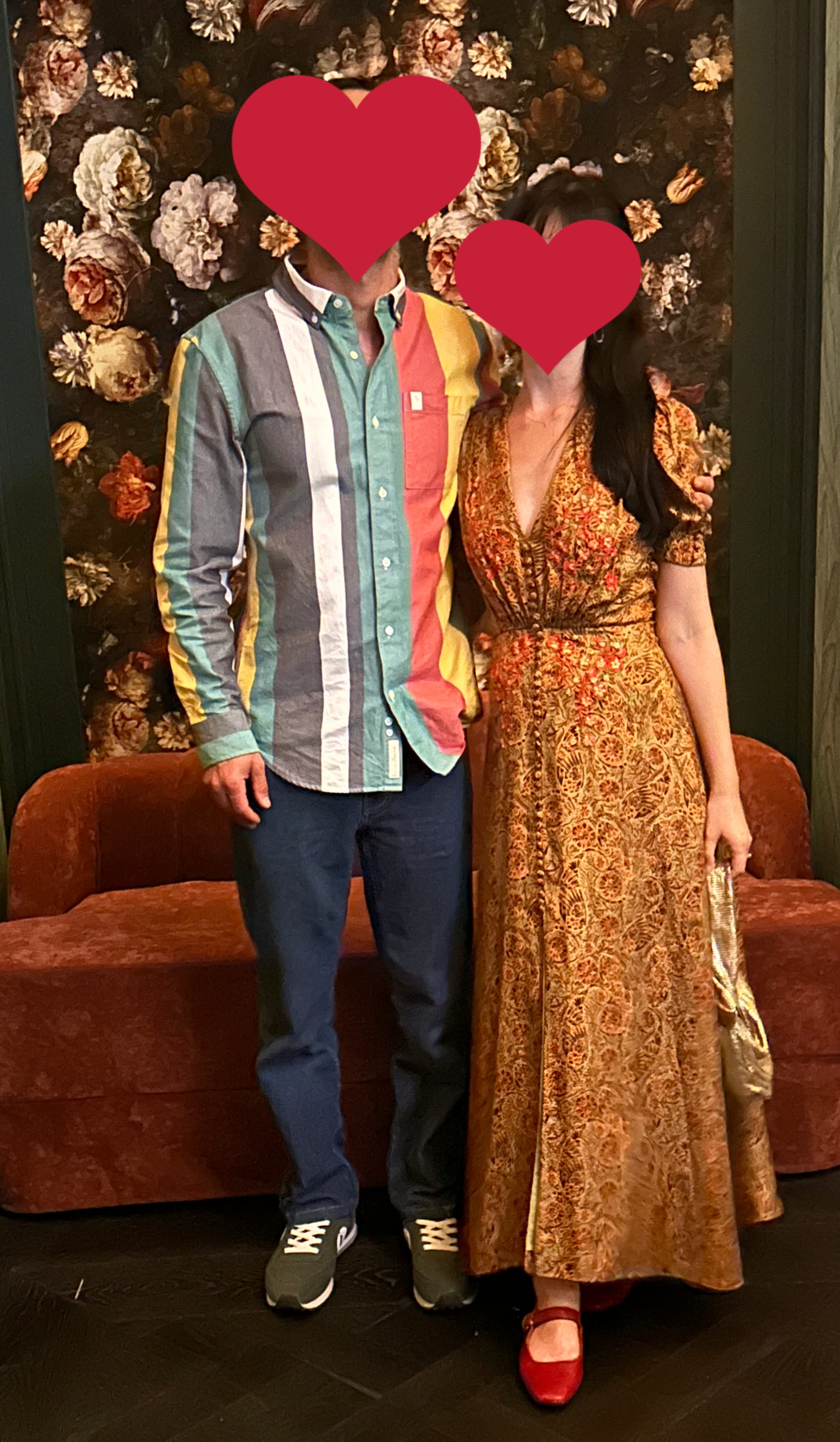 I also had a really fun family dinner with my husband, my mom, and our kids. I wore a Saloni silk dress from TheRealReal (they usually run for about $900, which is insane, but they’re anywhere from $70 to $200 on TheRealReal) along with the same Sam Edelman flats, but in another color. (In case any men are wondering, my husband’s shirt is Aime Leon Dore.)