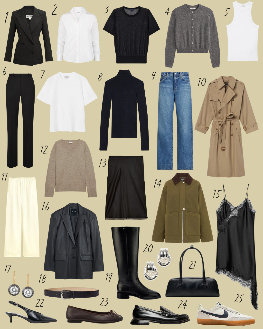 Every capsule wardrobe (at least the ones I build!) should start with a few key pieces—a crisp button-down, a trench coat, a blazer, etc. But with Cartoons Hate Her in mind, I wanted to make sure these staples felt fashionable without being boxy, so they flatter her figure while staying versatile. My focus was on styles that work just as well for daytime errands as they do for date night, and that ultimately fill her closet with timeless core staples—the kind that make it easy to mix in trend-forward pieces when she wants to. I also leaned toward contemporary brands that offer a competitive price point. That said, some of these picks are still investments, so I’ve included similar options from Zara, COS, and beyond. Because in my opinion, a great wardrobe can be achieved on every budget if you know what (and where) to buy.