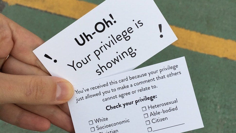 One of the now-whimsical vestiges of the 2010s was the idea of “checking your privilege,” the required atonement required of anyone higher up on the oppression ladder before speaking. Technically, it meant that you should consider all the unfair advantages you have which might have colored your lived experience, before “talking over” more marginalized voices. But really, it meant that you needed to shut the fuck up.