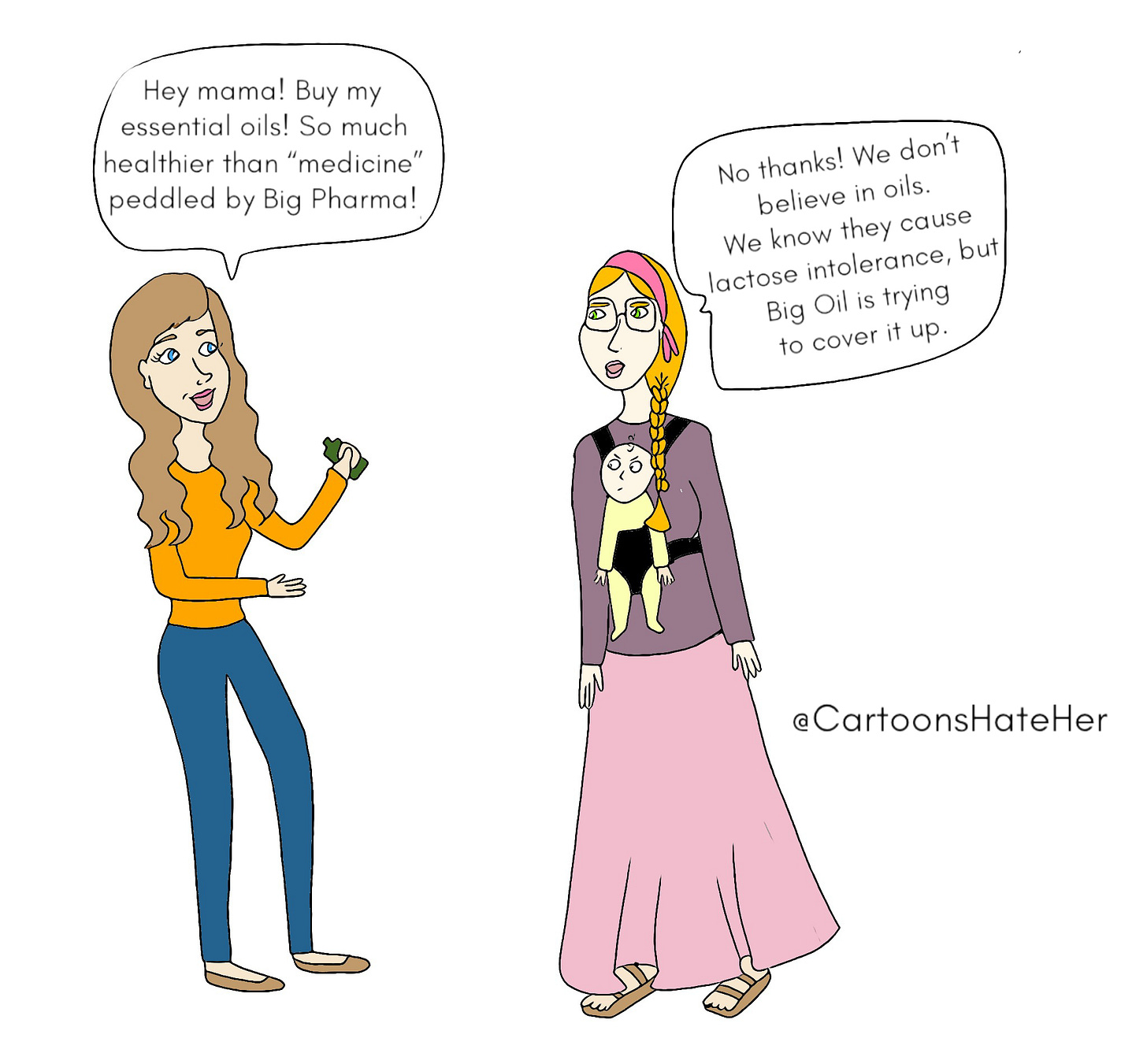 You can find these women on Twitter too, although these days they tend to be more of the trad/crunchy variety, obsessed with martyrdom and sacrifice regardless of any real upside. It’s a big contest of who can deplete themselves the most without asking a husband for help, while also insisting that everyone needs to have five or more children. You can’t log onto Parenting Twitter without some butter churning ass bitch living in a log cabin, dressed like Baba Yaga, telling you that you’re “weak” or “spiritually communist” because you wore your baby in a baby carrier instead of holding him with your arms all day as God intended. Usually, this person is either a man in Nigeria or was a liberal atheist seven years ago, but that’s beside the point.