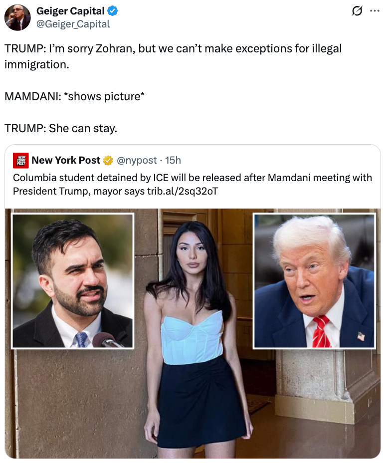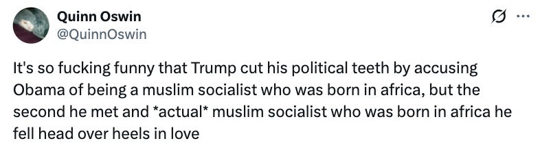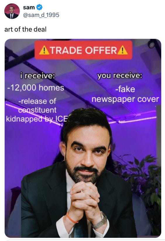 As I have covered before, Trump kinda loves Mamdani. He is everything Trump would hate, and yet, he seems inexplicably drawn to him. This week, they had a “productive” oval office meeting, where Trump agreed to release a student detained by ICE at Mamdani’s request.