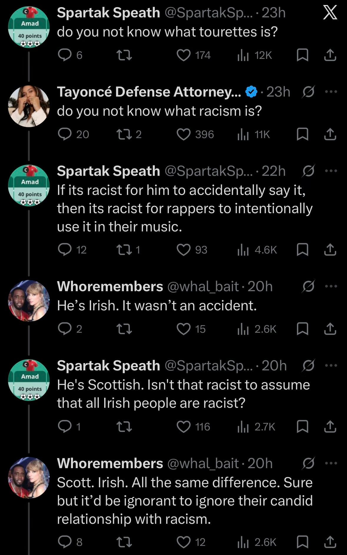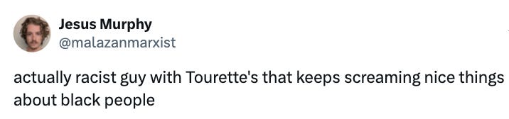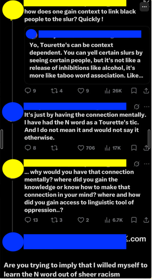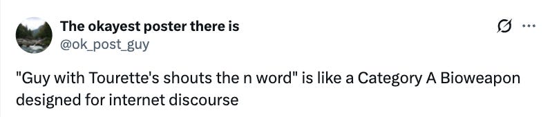 To be clear, it would be extremely upsetting for Black people to hear a horrible racial epithet hurled in their direction, even from someone with Tourette’s! Truly a “this sucks for everyone involved” situation. But damn, did it make for some…interesting takes.