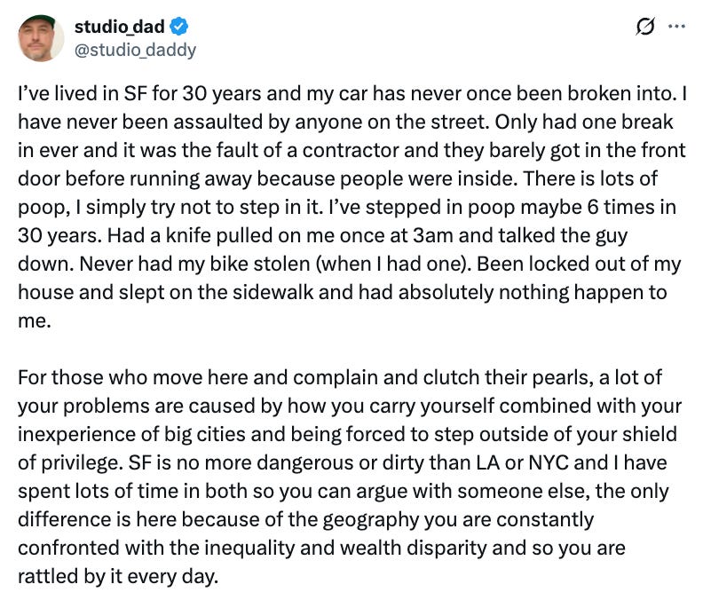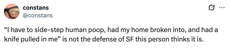 Urban disorder has been a topic this week, and one guy weighed in with his take about why San Francisco isn’t as bad as the Karens and pearl clutchers make it sound. His evidence includes “only” stepping in human poop six times, and having a cheeky knife pulled on him no more than once. Oh, and a home invasion.