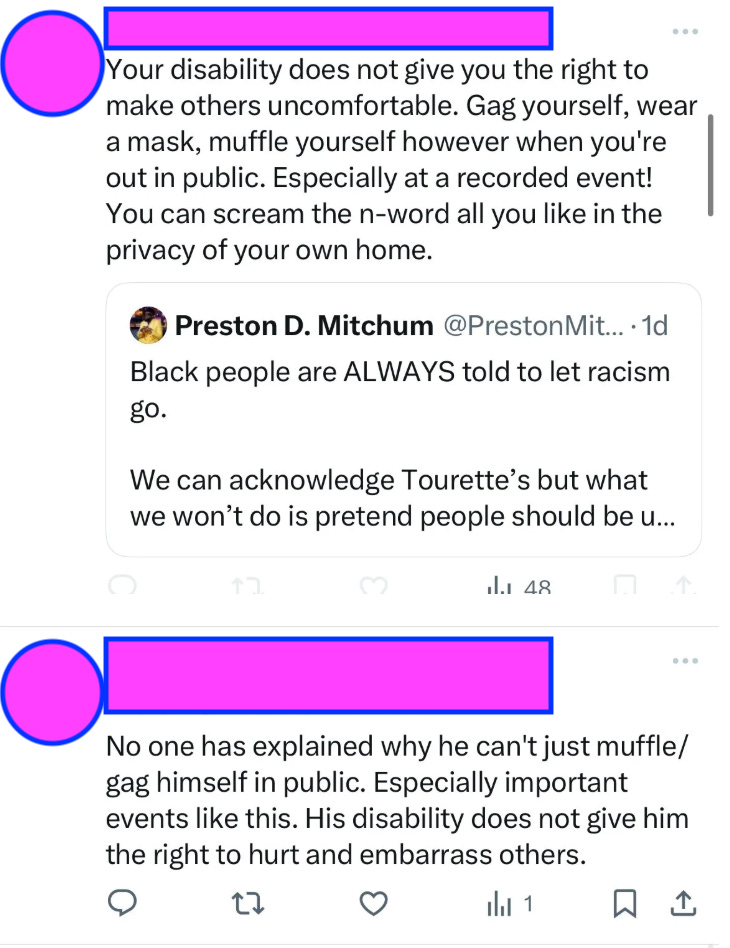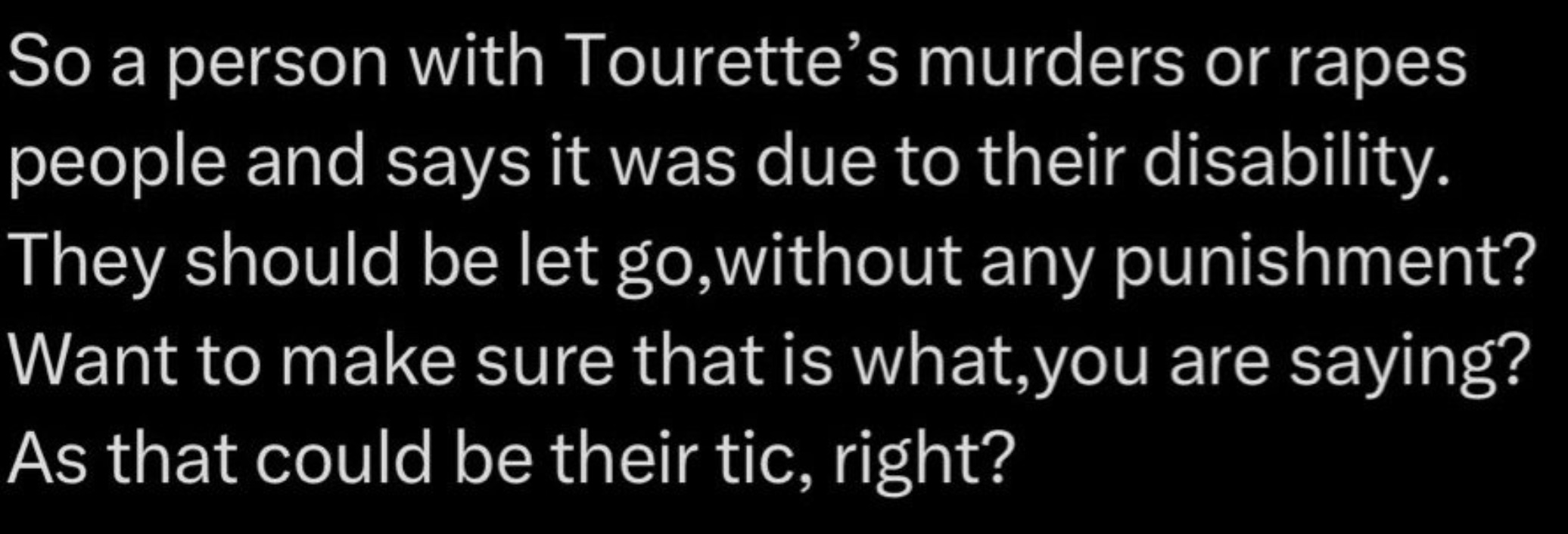 This person (name censored by the Twitter user who posted it) believes that a person with Tourette’s involuntarily saying a racial slur is the same thing as a person in a wheelchair saying a racial slur: