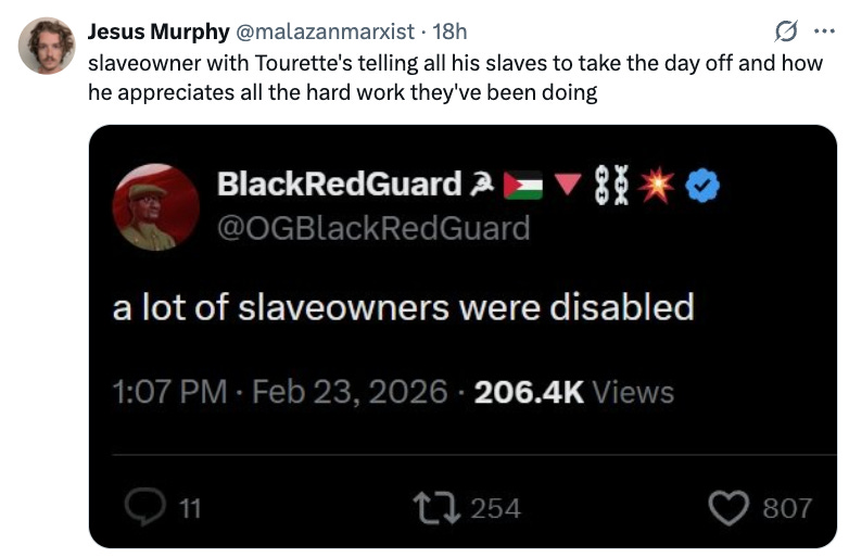 So, when I first saw someone randomly joking about “someone tweeted that slaveowners were disabled” I thought it was a disability advocate saying we should go easier on slaveowners because they were the DoorDash users of their time, riddled with mast cell activation syndrome that makes frozen food deadly. As it turns out, this was actually just adjacent to the whole Tourette’s thing—basically, having Tourette’s doesn’t give you a free pass to say the N-word, because if it did, we’d have to give a free pass to all the disabled slaveowners.