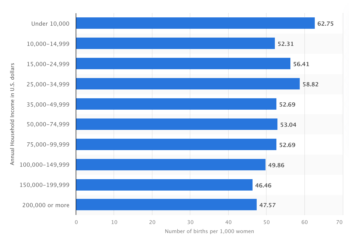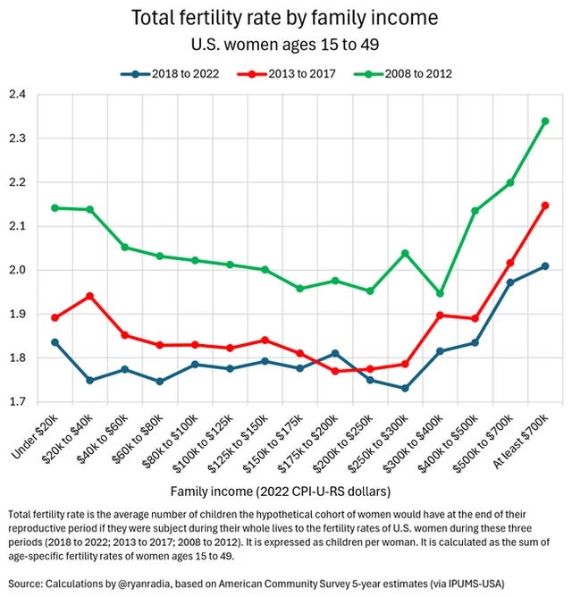 One could argue that the Nordic countries (famously beloved by American Redditors desperate to leave the US) haven’t gone far enough because they aren’t paying their citizens an extra $50K annually. But it’s my suspicion that this also wouldn’t help. Perhaps a payment contingent on the birth of an additional child would help, but it would have to be pretty hefty to make a meaningful difference. I’m even less convinced that UBI, or even tax credits for families, would do anything. UBI might help a few families who were already on the fence about additional children, but it wouldn’t give someone the desire to have children if they don’t want them. Besides, it’s my hunch that if existing families were given extra money or benefits not contingent on the birth of a new child, they would use it to improve the lives of the children they already have, not to make room for more children. In fact, this is more than just a hunch—aside from housing costs (which I addressed already) people today enjoy a much higher standard of living than people even just a few decades ago, and certainly a much higher standard of living then in the 1960s. As a result, they’ve had fewer children, and given those fewer children richer lives. Today, while birth rates are higher among families making ultra-high incomes, they are actually lower in families making $200K compared with families making $25K annually. There’s no evidence to suggest that an annual payment of $25,000 or even $50,000 to every family would make a measurable impact.