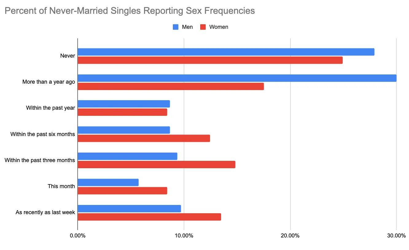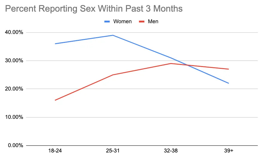 It gets worse too—it’s not just the relative wealth of the world (and the resulting higher standards for living, parenting, leisure time and more.) It’s the fact that many people just aren’t meeting at all, let alone getting married and having kids. Some on the right believe that today’s young people are engaged in a depraved sex-fest because of rage bait TikToks or thinly-veiled advertisements for sex workers. But young people are having less sex than ever, and are increasingly sexually repressed and lonely. My surveys (which are probably a bit biased) reflect this. In a recent survey, roughly 30% of singles said they were virgins, and only a minority of heterosexual people reported having sex within the past three months.