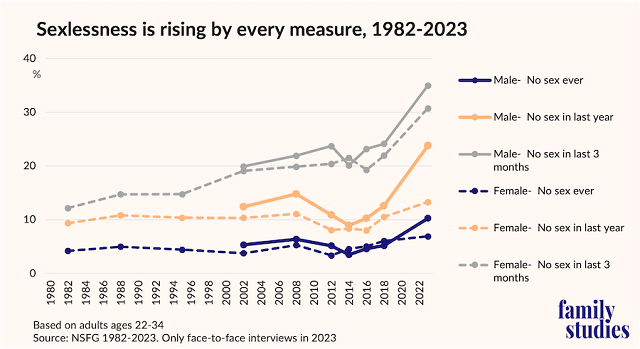 It’s not just my surveys, which I admit are far from perfect. The Institute for Family Studies shows fewer and fewer young people having sex, and increasing numbers of virgins: