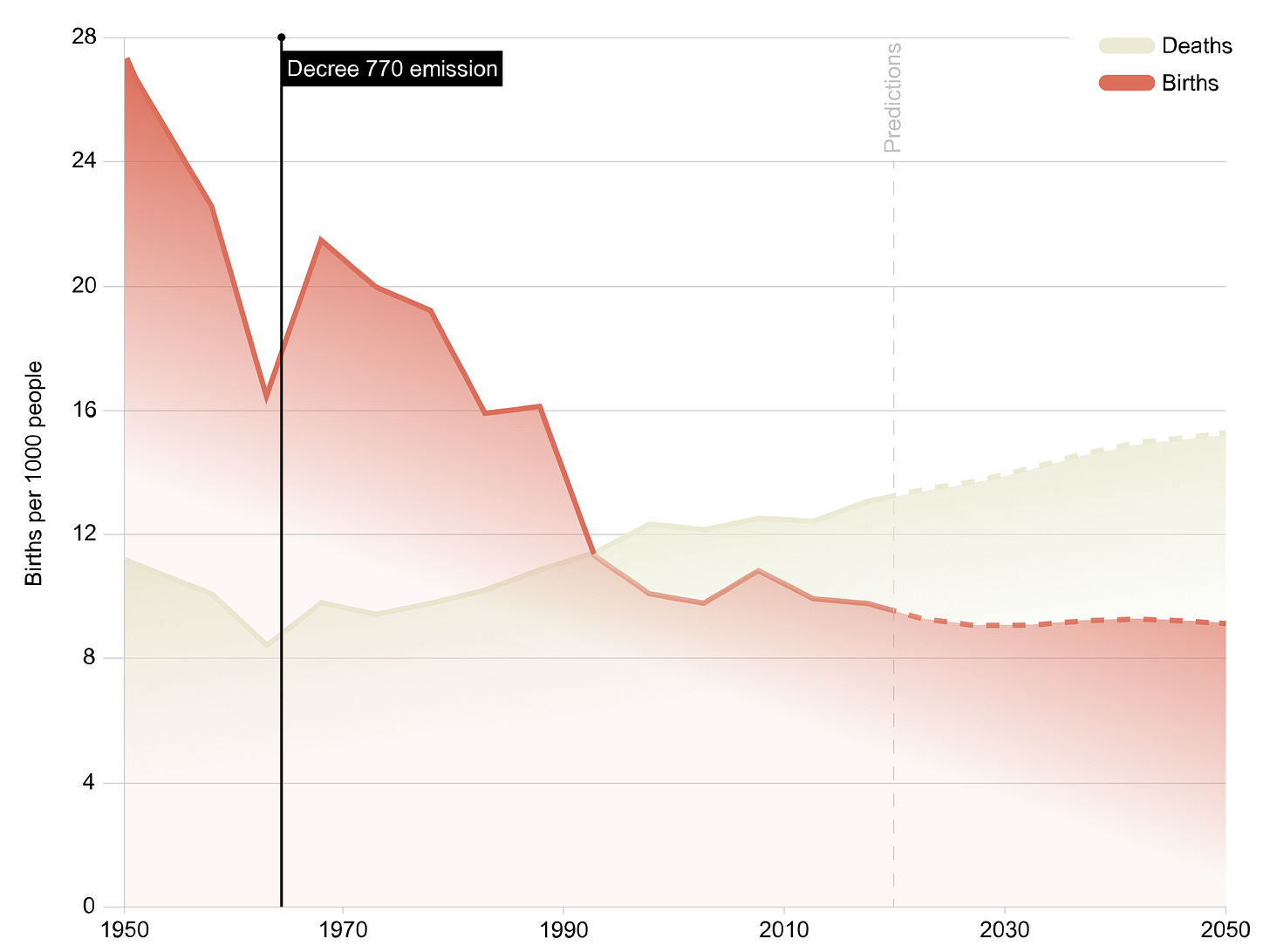 But these plans sound a lot like Decree 770, a law passed in Romania in 1967 to boost the birth rate. Almost all instances of abortion or birth control were banned. Women were monitored monthly by gynecologists to make sure they weren’t circumventing the decree. Sex education in schools shifted to extolling the virtues of motherhood and having many children. While TFR initially jumped from 1.9 to 3.7, there were pitfalls. Wealthier women were still able to procure contraceptives and abortions, which meant the birth rate increase happened primarily among poorer women. This meant that many children grew up with inadequate resources. Many were sent to orphanages, and many died. Romania’s child mortality rate eventually rose to ten times that of neighboring countries. Many of the abortions were primitive and left women sterile, which also prevented future births. The decree was abolished in 1989.