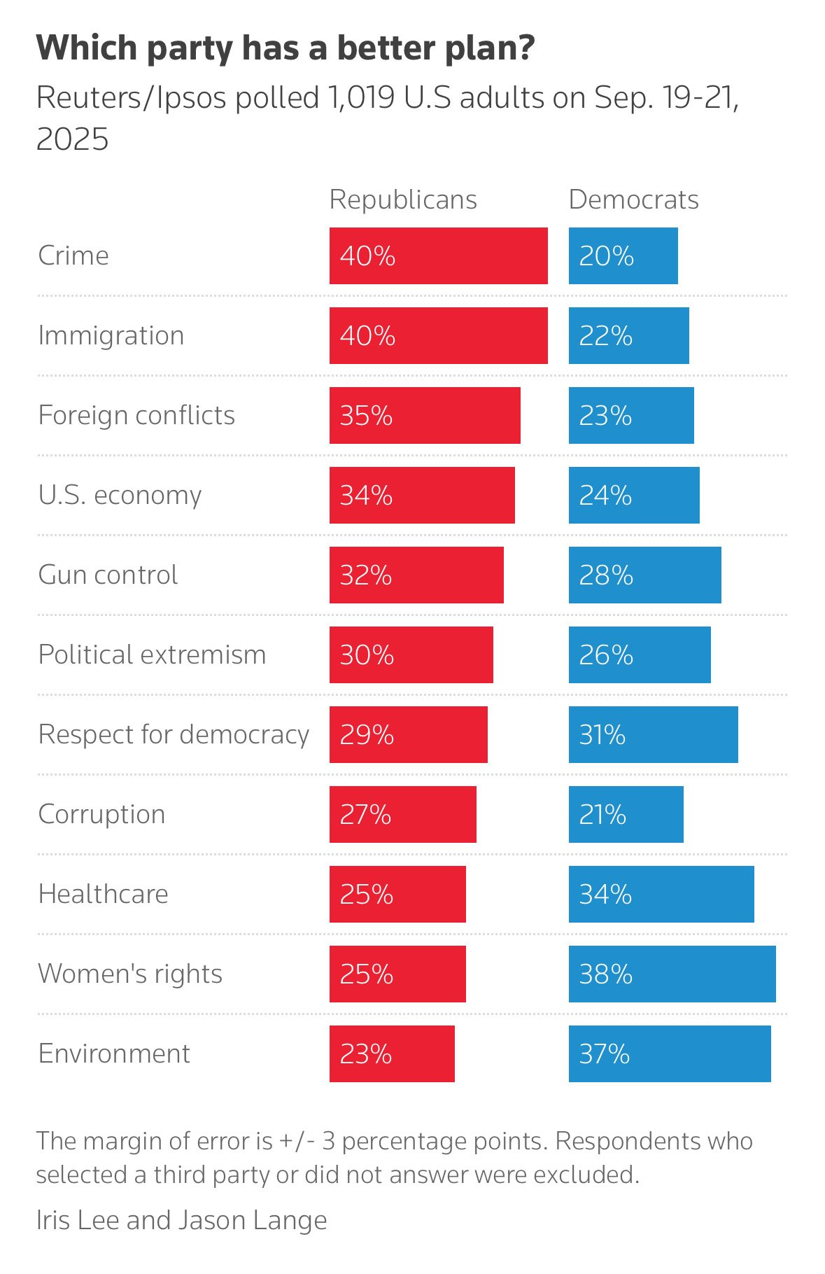 Obviously, this wasn’t what most of us would have expected five years ago. The GOP also won a trifecta, so the failure wasn’t specific to Kamala Harris. According to YouGov, 64% of Americans view the Democratic party unfavorably. The GOP has gained with voters of color, especially black voters, who were previously taken for granted as Democratic voters. And a Reuters/Ipsos poll has Americans trusting Republicans over Democrats for the majority of issues. Take, for example, that with all the anti-democratic rhetoric and corruption that Democratic voters feel is obviously a Republican problem, voters rate Democrats and Republicans very closely on democracy and corruption, within the margin of error:
