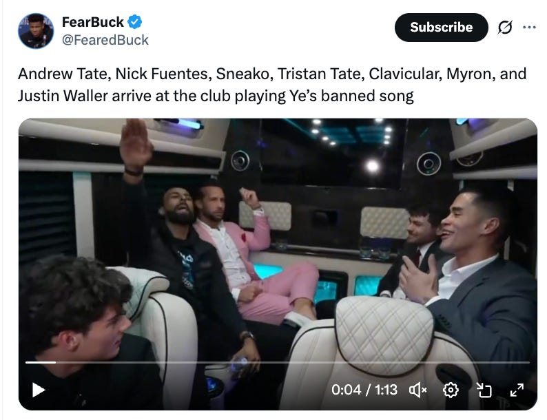 Of course, people cringed. Not that I ever thought any of these people were cool, but seeing them together in a limo, giving Temu 2009 club-rat hustle bro core, making Hitler roll in his grave with their bizarre edgelord We Are the World version of the Third Reich just really sends the message home. And across Twitter, people had the same “wow, this is embarrassing” reaction, including people who are unambiguously right-wing.
