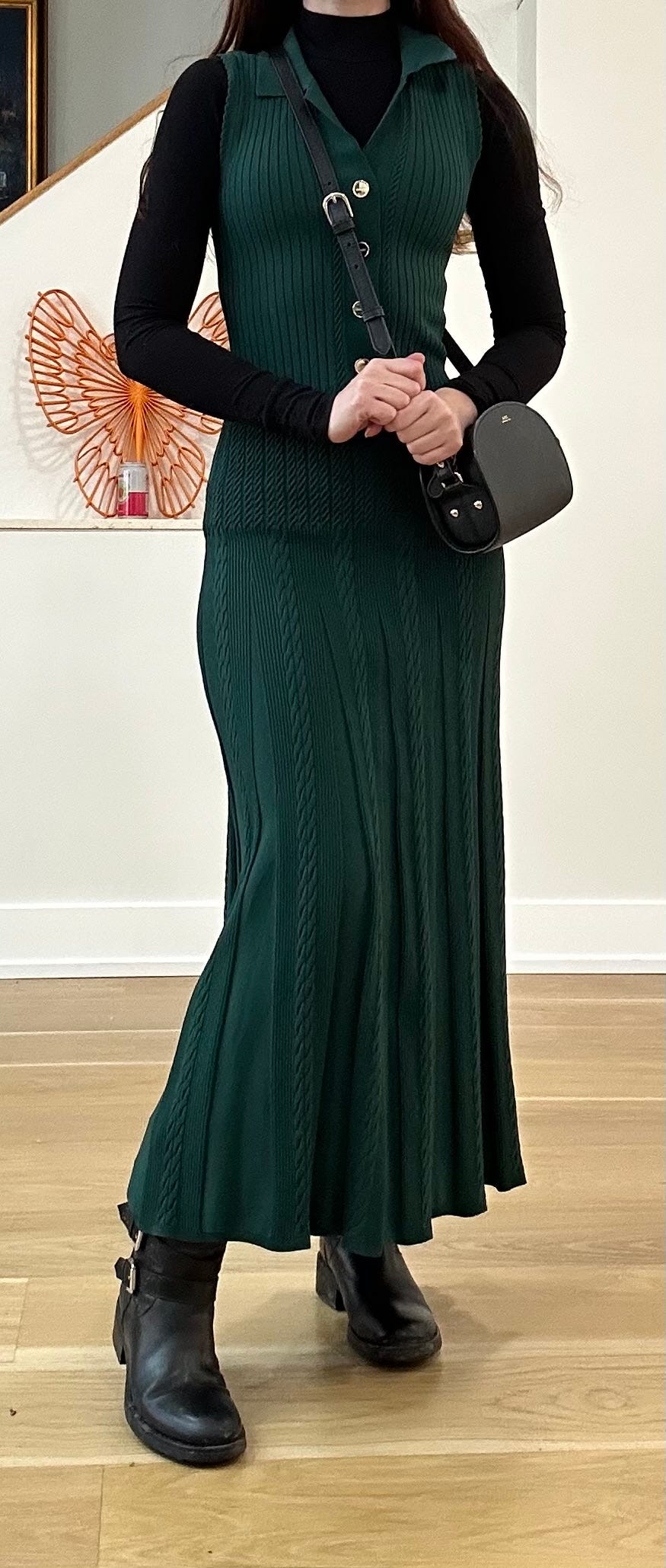 I’m really happy with this outfit. I bought this green Sandro dress a while back, and I always wore it as a standalone piece for warmer months, but it just occurs to me that I could layer it. I wore it with a Skims black turtleneck, my APC mini demi lune bag (a staple for me) and me Aquatalia moto boots (old, second hand, no link) which are far chunkier and edgier than my usual style, so it’s been a challenge to incorporate them.