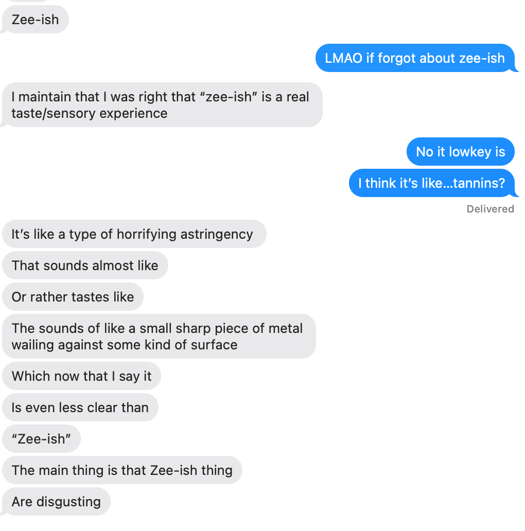His issues with food went beyond typical complaints of things being “yucky.” He invented a completely new way for food to be disgusting—zee-ish, which he now explains as a “horrifying astringency,” and something he still insists is real:
