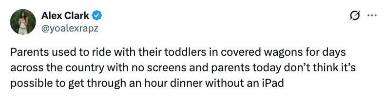 The rule about these tablets is that they are only for vacations. They can use them as much as they want on planes and in airports, and they can use them a little bit in hotels. Then, as soon as we go home, the tablets disappear. At home, they can watch a little bit of TV or a movie on the family television, but we usually cap screen time at one hour a day—and it’s always after 3 PM. Am I a hunter-gatherer Substack-style perfect mom who eschews television, diapers and checks notes sofas? No. But I am not, by any stretch of the imagination, a mom who expects nonstop algorithmic screens to “raise my children.”